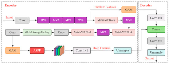 To address these issues, we make three structural modifications: (i) replace the Xception backbone with the lightweight MobileViT network, which efficiently captures global semantics; (ii) insert an efficient Global Attention Mechanism (GAM) into both shallow and output layers of MobileViT to strengthen small-object representations; and (iii) reduce dilation rates in the ASPP module to 1, 2, 3, better adapting the network to tiny-target segmentation.