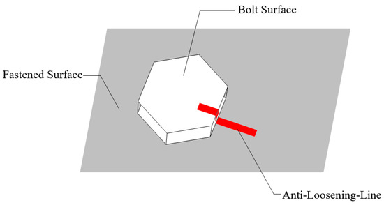 The study involves two types of fasteners, denoted bolt 1 and bolt 2. Bolt 1 is a single screw that mates with a pre-tapped hole in the landing door structure, whereas bolt 2 is more complex and consists of a bolt, a square nut, a spring washer, and a plain washer. Because the nut and washers serve only auxiliary anti-loosening functions, looseness is judged solely by the relative motion between the bolt body and the square nut. In practice, two anti-loosening lines are painted—one on the bolt head and one on the fastened surface of the landing door—to indicate the tightening state. Under normal conditions, the two lines remain parallel; when the joint loosens, the lines deviate by a measurable angle, as shown in Figure 10.