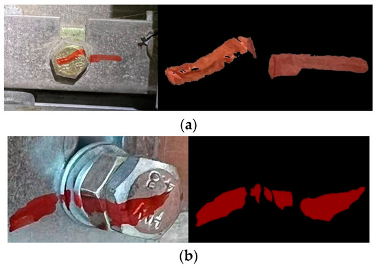 However, hand-painted lines are irregular and lie on rough surfaces, so direct parallelism assessment is unreliable. The segmentation results of the anti-loosening lines for bolt 1 and bolt 2 are shown in Figure 11a,b, respectively. To address this issue, the line regions are first extracted by semantic segmentation. A convex-hull algorithm then yields the minimum convex polygon enclosing all pixels, after which a rotating-caliper method fits the minimum bounding rectangle, providing a standardized representation of each anti-loosening line.