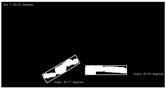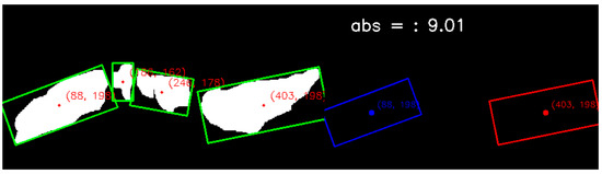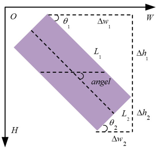 As illustrated in Figure 12, once the minimum bounding rectangle has been obtained, the image-pixel coordinate system—with its origin at the upper-left corner and positive x and y axes pointing rightward and downward, respectively—is adopted as the reference. Using the rectangle’s four vertices , the lengths of the two adjacent sides, and , are calculated as follows: