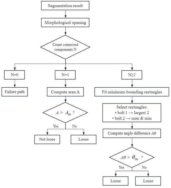 Looseness determination workflow, including preprocessing, component counting, area thresholding, and angular deviation analysis.