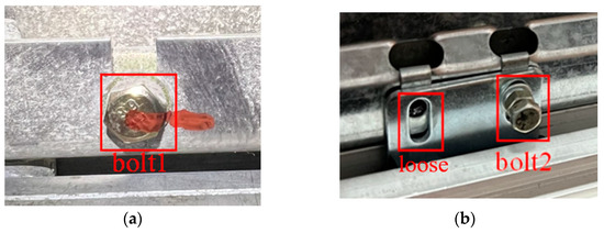 With the rapid development of sensor, signal processing, and machine vision technologies, researchers, both domestically and internationally, have proposed various methods for detecting bolt loosening. For example, Pal et al. [3] utilized sensors to obtain frequency data, employing position-determined fixed coefficients as variables and continuously updating the model to determine the actual position and fixed coefficient of the bolts at varying degrees of looseness. Sun et al. [4] embedded piezoelectric sensors at predetermined positions on the bolt heads and developed a smart piezoelectric bolt to measure the ultrasonic flight time of the bolt shaft. Such sensor-based detection methods enable quantitative detection with excellent results; however, they are costly and require complex installation and calibration. In comparison, vision-based detection methods have become a hot research topic due to their lower cost, stronger environmental adaptability, and higher detection efficiency [5,6]. Numerous studies have shown that vision-based detection methods have significant advantages in bolt loosening detection. For instance, Zhang et al. [7] directly output the bolt tightening status using a region-based convolutional neural network, achieving precise qualitative detection; Kong and Li [8] applied image registration technology, incorporating the rotational angle differences caused by bolt loosening into error evaluation, enhancing detection accuracy. Huynh et al. [9] combined the RCNN deep learning algorithm with Hough line detection to achieve automatic bolt detection. Lyu [10], on the other hand, utilized YOLOv5 and error ellipse theory to identify the rotational angle of bolts, achieving good detection results. In addition, Wang et al. [11] proposed a detection algorithm for loose bolts on low-quality images of roofs of rail vehicles, using a line-array camera to capture bolt images and applying brightly colored anti-loosening lines on the bolts. By dividing the roof into multiple sub-regions and using the HALCON object detection framework for bolt positioning, they calculated the angle of the anti-loosening line on the bolts to determine if they were loose. This method successfully detects roof bolt loosening by fitting the anti-loosening line as a straight line and comparing the angles, demonstrating high accuracy.