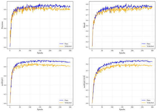 The experiments were run on an NVIDIA GeForce RTX 4090 GPU (24 GB RAM) and an Intel Core i9-13900KF CPU @ 2.50 GHz. The software environment comprised Python 3.11.9, PyTorch 2.2.1, and CUDA 12.4. Training employed the modified DSEW-YOLOv8n.yaml configuration with a batch size of 32, 300 epochs, and an input resolution of 640 × 640. Label smoothing was set to 0.1 to mitigate over-fitting, the learning rate to 0.001, and weight decay to 5 × 10−4.