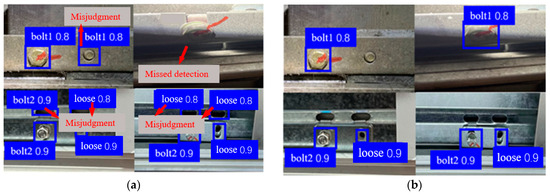 Visual comparison of bolt detection: (a) baseline YOLOv8n; (b) DSEW-YOLOv8, demonstrating the improved detection of small bolts and reduced missed detections by our method.