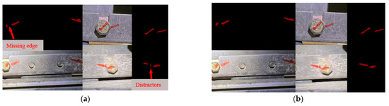 To visually compare segmentation performance, the baseline DeepLabv3+ and the improved model were applied to the same dataset, and the results are visualized in Figure 18. The baseline output exhibits two typical failures—Missing edge, where the tip of the anti-loosening line is lost, and Distractors, where stains or scratches are falsely segmented as lines. In contrast, the proposed model produces continuous, complete anti-loosening lines and effectively suppresses background noise. These visual findings confirm that the improved network is more robust and precise, substantially reducing both false negatives and false positives in anti-loosening-line segmentation.