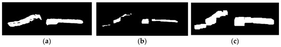 Preprocessing steps: (a) binarization; (b) erosion; (c) dilation. These steps correspond to the initial stages illustrated in Figure 13.