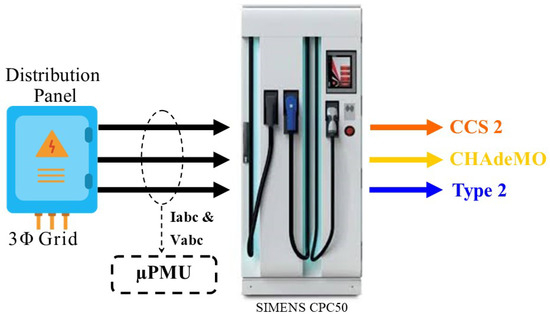 To learn the charging pattern and power flow from the charger, machine learning algorithms require three-phase voltage and current data. Therefore, a micro phasor measurement unit (PMU) was installed in the downstream of the distribution panel in the host institute’s charging station to collect these data, as depicted in Figure 1. The PMU is designed to carry out high-precision synchronized measurement to provide real-time, high-resolution data on voltage and current phasors within electric power distribution networks. It provides time-stamped measurements, typically synchronized via Global Positioning System (GPS) signals, thereby enabling accurate insight into the dynamic behavior and power quality of the grid [26]. The PMU delivers high-resolution synchronized measurements per phase across the three-phase system. These include the instantaneous voltage magnitude, voltage phase angle, current magnitude, and current phase angle. Data acquisition is performed at a high temporal resolution, with a maximum sampling rate of 100 Hz [27,28].