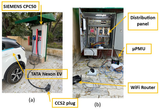 Hardware test setup: (a) EV and charger, (b) PMU connection in distribution panel.