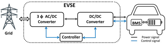 The EVSE modeled in this work is a Level 3 charger with a nominal rating of 50 kW at 415 V employing a two-stage power conversion topology. This configuration was selected due to its widespread adoption and relatively straightforward implementation in fast-charging applications. As depicted in Figure 3, the system comprises two distinct power electronic stages: the first stage is a three-phase full-bridge AC/DC converter, and the second stage is a bidirectional buck–boost DC/DC converter. The primary function of the AC/DC converter is to regulate the DC link voltage while simultaneously ensuring the desired power factor at the grid connection point. Concurrently, the DC/DC converter is responsible for managing the charging and discharging processes of the EV battery based on the demanded active power. To facilitate independent control of the power flow, the regulation of active and reactive power is decoupled: reactive power is handled by the AC/DC converter, while active power is regulated by the DC/DC converter. The subsequent sections provide a detailed explanation of the control approach that enables this decoupled power regulation. Given the established advantages in power electronics control, the direct-quadrature (dq) control method is employed for reactive power regulation via the AC/DC stage.