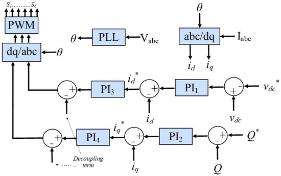A typical block diagram illustrating a dq-based VSC controller is presented in Figure 4. In this configuration, the error in the DC link voltage is processed through a proportional–integral (PI) controller to generate the reference for the direct-axis current , which directly correlates with the active power flow. Conversely, the quadrature axis current reference is typically set based on the desired reactive power injection or absorption. Consequently, with the quadrature component of the grid voltage ideally driven to zero through PLL synchronization, the converter output voltage equation can be expressed as follows: