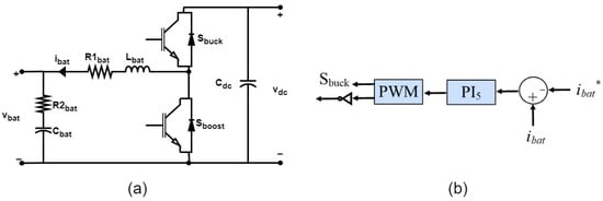 The schematic illustrates a high-efficiency bidirectional DC/DC converter, crucial for seamless power transfer between a battery energy storage system and a DC bus, as shown in Figure 6a. While currently discussed for power flow from the DC bus to the battery (operating in buck mode for charging), its design inherently supports power transfer in both directions. The core of the power conversion lies in the half-bridge configuration, featuring two actively controlled power semiconductor switches, and . In buck mode, is modulated to step down the DC bus voltage (), while acts as a commutating diode, enabling controlled current flow into the battery. Conversely, for power transfer from the battery to the DC bus (boost mode), would be actively modulated to step up , with acting as a diode. A DC link capacitor, , is strategically placed on the DC bus side to effectively smooth voltage ripples and maintain a stable .