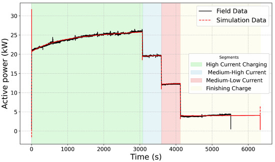 Figure 7 presents the active power (in kW) over time for both simulation and field data. The charging cycle is divided into four color-coded regions corresponding to different SOC-dependent current control phases: high current charging, medium-high current, medium-low current, and finishing charge. In the first phase, spanning from the beginning of the charging process up to approximately 3100 s, the battery is charged at a high current rate (around 0.7 C-rate). During this interval, active power increases gradually, and the simulation data align closely with the field data, demonstrating the model’s ability to accurately capture the initial power ramp-up. Minor deviations observed in the field data can be attributed to fluctuations in the grid voltage or noise in the measurement instruments.