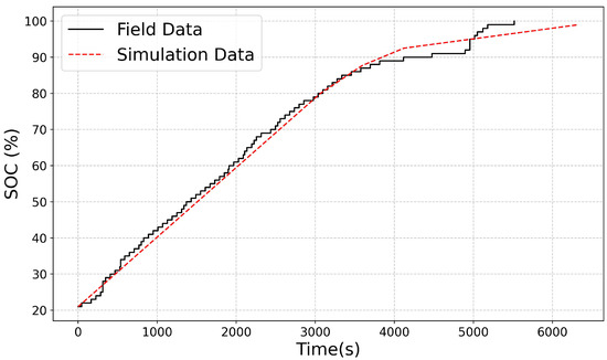 where and represent the time arrays of the field and simulation datasets, respectively. Both datasets were filtered to retain only the data points within this common interval, and the number of samples N used in the error metric formulas corresponds to the length of this filtered time range. The MSE and MAE values were found to be 0.13 and 0.14, respectively. These values indicate that, on average, the squared and absolute deviations between the simulated and real SOC values are quite small, pointing to the model’s capability to closely track actual charging trends.