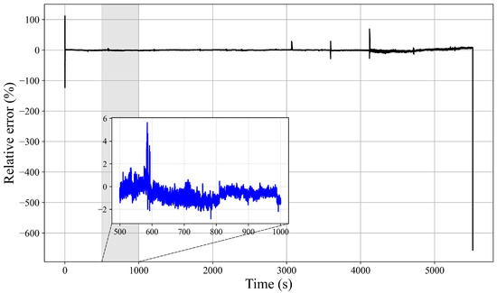 To quantify this agreement, Figure 9 presents the relative error (%) between the simulation and field data over time. Predominantly, the error remains tightly clustered around zero, indicating strong predictive performance. The inset provides a zoomed-in view of the relative error during the 500–1000 s window, highlighting minor deviations, primarily within a ±2% range. Occasional spikes correspond to abrupt step transitions in the charging power in field measurements, which are expected in practical deployment scenarios.