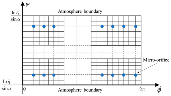 Figure 1a illustrates the structure of ACBMOs, including two rows of micro-orifices. The schematic of the rotor in ACBMOs and the relationship between the conical and Cartesian coordinate systems are shown in Figure 1b and Figure 1c, respectively. The relationship between the bearing radius R and the axial coordinate r is derived as follows [18]:
