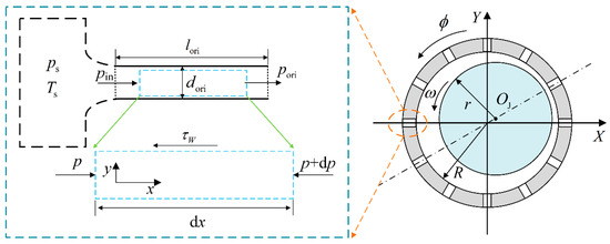 As illustrated in Figure 3, a model for the gas mass flow rate with frictional loss in micro-orifices is developed. In this model, ps denotes the supply pressure, pin the inlet pressure of the micro-orifices, pori the downstream pressure, dori the diameter of the micro-orifices, and lori the length of the micro-orifices.
