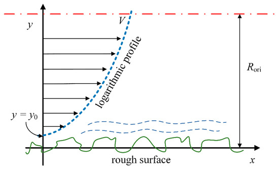 Solving Equation (14) requires determining the friction factor f for compressible gas flow in micro-orifices. Recent research [21] has shown that f can be obtained by solving the coupled Poisson–Boltzmann and Navier–Stokes equations; however, this approach involves computationally expensive solutions to complex differential equations. To reduce the computational cost, the present study adopts a semi-empirical correlation method. The velocity profile of turbulent flow in the micro-orifice cross-section is shown in Figure 4. Owing to the extreme thinness of the viscous sublayer near the micro-orifice walls, the velocity profile across the entire cross-section can be approximated by the logarithmic distribution characteristic of the turbulent core region, with an equivalent hydraulic wall location at y0.