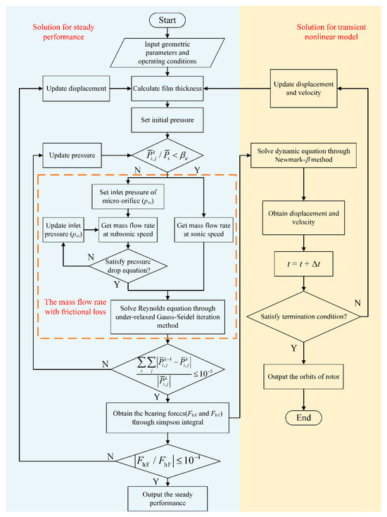 The overall flowchart of this study is illustrated in Figure 6. The left branch presents the lubrication solution algorithm for the parametric analysis of micro-orifices. When the pressure ratio of the micro-orifices falls below the critical ratio βκ, the airflow reaches sonic velocity, where the inlet pressure equals the outlet pressure. Conversely, when the pressure ratio exceeds βκ, the inlet pressure pin must be determined iteratively.
