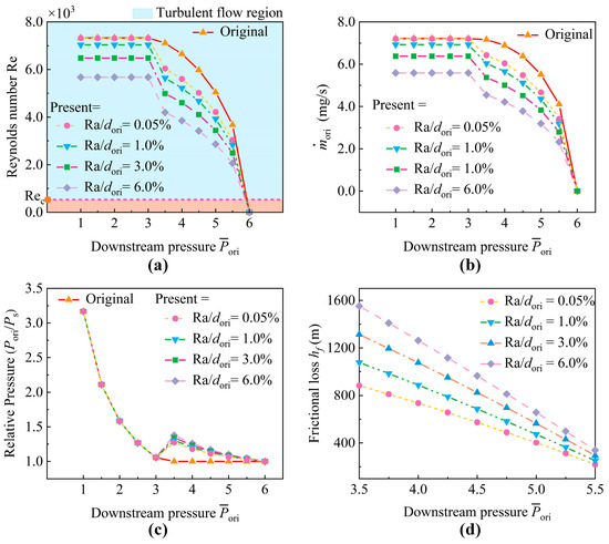 The relationships between the mass flow rate and the length-to-diameter ratio of micro-orifices at Ra/dori = 0.05% are illustrated in Figure 12. It can be observed that as the length-to-diameter ratio increases, the relative error in the mass flow rates calculated using the proposed model with frictional loss and the conventional model without frictional loss also increases. Notably, when the micro-orifice length-to-diameter ratio is less than 4, the reduction in the mass flow rate is below 5% at Ra/dori = 0.05%.