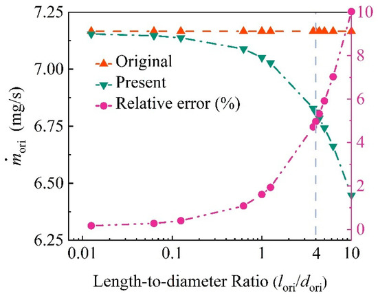 In this section, the proposed model for the mass flow rate in micro-orifices accounting for frictional loss is employed to investigate the influence of relative roughness and length-to-diameter ratio on flow characteristics such as mass flow rate and Reynolds number. Comparative analyses are then performed against the original model [5,18], which neglects frictional loss. First, the effect of micro-orifice length-to-diameter ratio is examined under fixed parameters, namely dori = 0.08 mm and relative roughness Ra/dori = 1.0%. The parameters listed in Table 2 are used as default values.