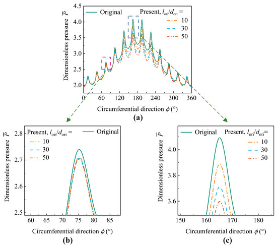 Effects of micro-orifice length-to-diameter ratio: (a) pressure distribution in the circumferential direction; (b,c) enlarged view of the marked region in (a).