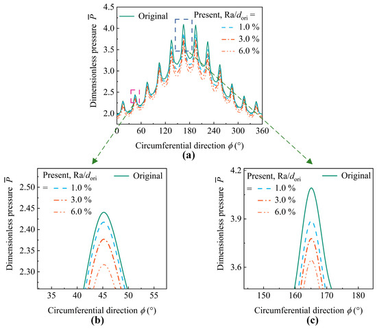 Effects of micro-orifice relative roughness: (a) pressure distribution in the circumferential direction; (b,c) enlarged view of the marked region in (a).