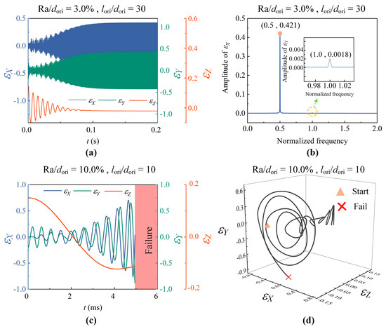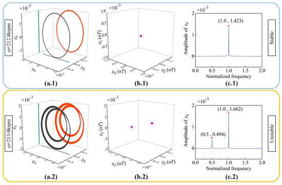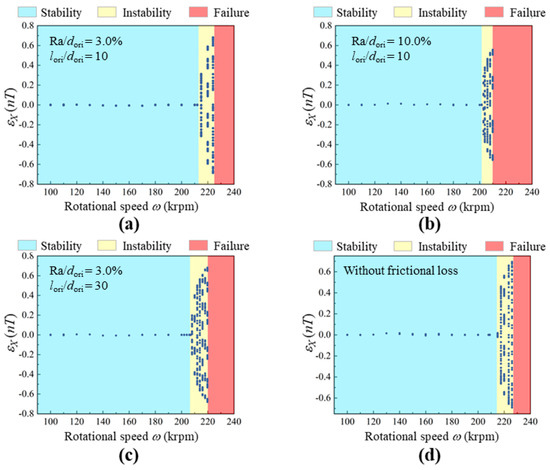 To obtain the nonlinear behaviors of the ACBMO–rotor model with frictional loss, the transient solution of Equation (6) is first obtained using the under-relaxation Gauss–Seidel iterative method. The load capacity is then calculated using the Composite Simpson rule. Finally, the nonlinear behaviors are determined by solving Equation (23). To ensure convergence of the limit cycle, a temporal discretization of 400 steps per period is adopted, and simulation results from the last 200 periods are retained.