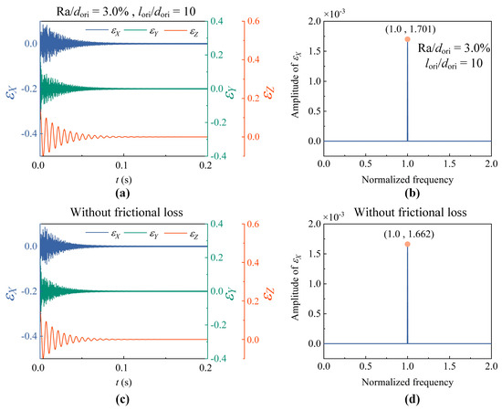 Figure 9a presents the denoised and filtered experimental vibration response. The time-domain responses, computed with and without frictional loss in micro-orifices, are compared with the experiment vibration response shown in Figure 9b. Subsequent FFT analysis is performed to extract the frequency-domain characteristics of these three signals, including the experimental signal and two simulated signals. One simulated signal is obtained from the baseline model that neglects the micro-orifice frictional loss [18]. A comparative amplitude analysis shows that the model incorporating frictional loss in micro-orifices results in a 13.3% relative amplitude error with respect to the experimental data, thereby demonstrating improved accuracy over the original model without the frictional loss, as shown in Figure 9c.