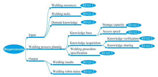 The requirements for the cloud-based welding process planning system were analyzed. The results are shown in Figure 2. The system requirements consist of three key components: input requirements, welding process planning requirements, and output requirements. The input requirements include the welding resources, welding tasks, and domain knowledge. The welding process planning requirements encompass the knowledge base, knowledge acquisition, and welding process specifications. The knowledge base requirements are focused on the storage capacity and the access speed. The knowledge acquisition requirements involve knowledge verification and knowledge sharing. The output requirements consist of the welding results and the welding robot status.