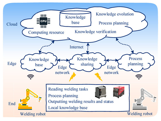 The proposed cloud-edge-end collaborative welding process knowledge base has a three-tier architecture that consists of end-based, edge-based, and cloud-based knowledge bases. These knowledge bases synergistically provide intelligent welding process planning by means of coordinated storage and computational capabilities.