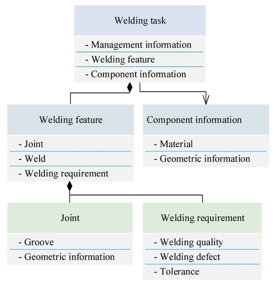 The ontology model for the welding tasks is depicted in Figure 4. In this model, a Unified Modeling Language (UML) class diagram is used to define the classes, attributes, and ontological relationships. The connecting lines that contain solid diamond shapes represent composition relationships. The connecting lines with arrows represent association relationships. The connecting lines containing triangles represent generalization relationships. The attributes of the welding tasks include the management information, welding features, and component information. Specifically, the component-information attributes include the material properties and geometric data. The welding-feature attributes consist of the joint characteristics, weld details, and welding requirements. The joint attributes include the groove specifications and geometric parameters. The welding requirements consist of the weld quality standards, defect criteria, and tolerance specifications.