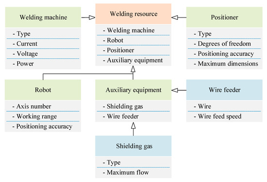 The welding resource model characterizes the performance of the welding equipment in order to ensure that the welding processes are properly executed and the desired welding results are achieved. In the welding resource ontology model, which is shown in Figure 5, the subtypes of the welding resources include the welding machine, robots, positioners, and auxiliary equipment. The detailed attribute specifications are discussed next.