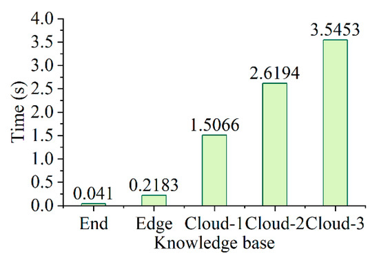 The knowledge-matching efficiency of the end-based, edge-based, and cloud-based knowledge bases was tested with a workflow. In this test, the end system sent a welding task, then the knowledge base received the task, performed knowledge matching, and returned the results. Finally, the end system received the results. The average matching latency was obtained after 10 tests of the workflow. As shown in Figure 11, the average matching latency was very small for both the end-based and edge-based knowledge bases, which was 0.041 s and 0.2183 s. This result demonstrates their suitability for real-time operations. The cloud-based knowledge base had significantly longer matching times of 1.5066 s, 2.6194 s, and 3.5453 s due to the network and computational overhead. The average response time of the edge-based knowledge base was reduced from that of pure cloud-based solutions by 86%, .