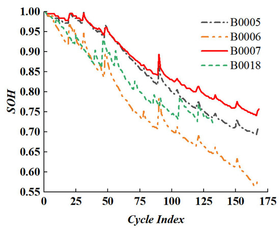 The SOH change curves of the four batteries are shown in Figure 1. It can be seen from Figure 1 that the SOH of the battery shows a downward trend with the increase in the cycle period. The battery SOH in this paper is defined from the perspective of capacity, as shown in Formula (1):