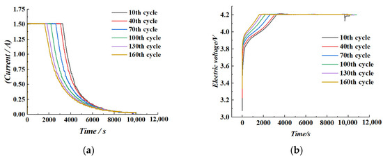 Charging curves with different cycle numbers. (a) Charging cycle current variation curve. (b) Charging cycle voltage variation curve.