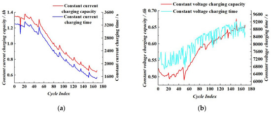 Curves of changing capacity and time at different charging stages. (a) Variation in the CC charging capacity and time. (b) Variation in the CV charging capacity and time.