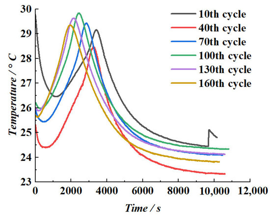Figure 4 illustrates the temperature variation trends of lithium-ion batteries at different cycle numbers (10th, 40th, 70th, 100th, 130th, and 160th cycles). The results indicate that, within each charging cycle, the battery temperature follows a typical pattern of initially decreasing, then increasing, and ultimately stabilizing. As the cycle number increases, the temperature variations exhibit progressively more distinct patterns, particularly the temperature rise observed during the constant current (CC) charging phase and the average temperature changes during the constant voltage (CV) charging phase. Analyzing these temperature variation patterns further reveals the evolution of the battery’s State of Health (SOH) over the course of cycling.