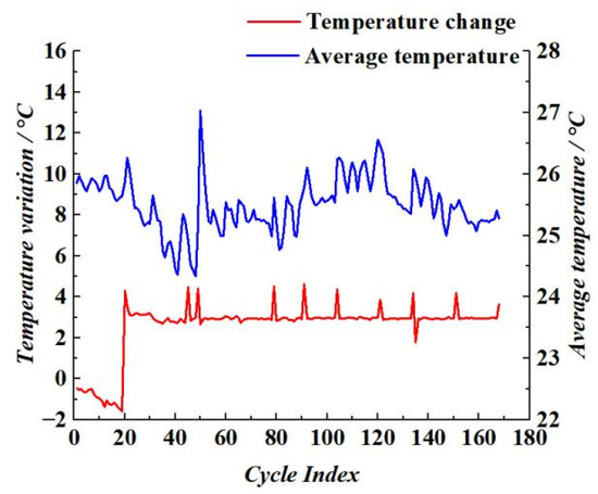 Figure 5 further reveals the variation trends of temperature rise during the constant current (CC) charging phase and the average temperature during the constant voltage (CV) phase across different cycle numbers. Although the evolution of battery temperature does not exhibit a direct linear correlation with capacity degradation, thermal fluctuations are observed during the charge–discharge process due to continuous heat generation from complex internal electrochemical reactions. As an important physical indicator of the battery’s internal dynamic behavior, temperature can indirectly reflect the battery’s State of Health (SOH) to a certain extent. Therefore, incorporating temperature variation characteristics into the SOH estimation framework provides useful supplementary information for monitoring battery degradation and predicting its remaining useful life.