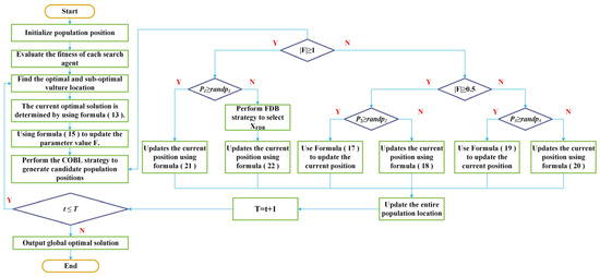 The African Vulture Optimization Algorithm (AVOA), proposed by Abdollahzadeh et al. [30] in 2021, is a novel swarm intelligence-based metaheuristic optimization method. This algorithm simulates the behavioral characteristics of African vultures during their foraging process, including food-searching strategies and variations in flight trajectories, to solve complex optimization problems. Similarly to AO, AVOA also divides the entire optimization process into four distinct stages, gradually driving the convergence of solutions.
