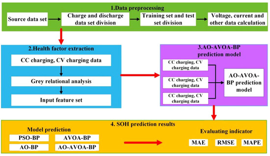 Consequently, this paper presents a BP neural network-based SOH prediction model optimized by the AO–AVOA dual-modal intelligent algorithm. The model first analyzes operational data during the battery charging phase and selects key health indicators using gray relational analysis to construct the feature input set. Then, the AO–AVOA is used to optimize the BP network parameters. Finally, experiments are conducted on publicly available NASA and CALCE datasets. The results show that the proposed model outperforms benchmark models in terms of prediction accuracy, generalization ability, and stability, indicating strong potential for practical engineering applications.