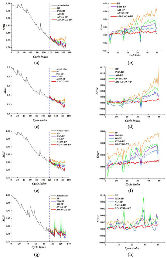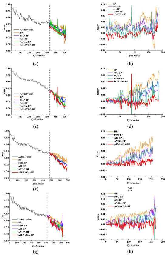 Using the B0005 and CS2-35 battery datasets as representative cases, a systematic comparative analysis was conducted to evaluate the performance of the proposed AO-AVOA-BP neural network model in the lithium-ion battery SOH prediction task. Experimental results demonstrate that the proposed model achieved significant advantages across multiple evaluation metrics, confirming its enhanced prediction accuracy and generalization capability. Specifically, on the B0005 battery dataset, the proposed model attained MAE, RMSE, and MAPE values of 0.0059, 0.0065, and 0.8320%, respectively. Compared with the BP model, these values were reduced by 80.78%, 82.04%, and 80.65%, respectively; compared with the PSO-BP model, they were reduced by 63.58%, 63.28%, and 63.20%, respectively; compared with the AO-BP model, they were reduced by 45.37%, 45.38%, and 44.86%, respectively; and compared with the AVOA-BP model, they were reduced by 67.58%, 69.63%, and 67.38%, respectively. These results indicate that the proposed model has a clear advantage in reducing prediction bias and suppressing error fluctuations.