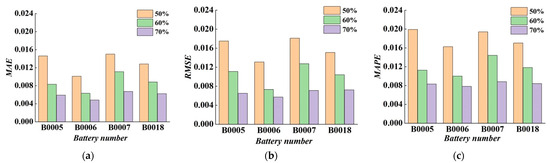 The evaluation index comparison chart of different training sets of NASA battery dataset. (a) MAE. (b) RMSE. (c) MAPE.