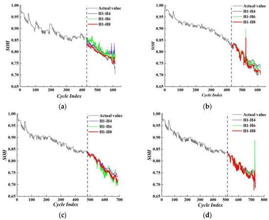 As shown in Figure 13, when the H1–H8 combination is used as input features, the predicted SOH curves closely align with the actual values, demonstrating high overall fitting accuracy. Moreover, the predicted trends exhibit the smallest fluctuations across all cycling stages, resulting in smoother and more stable estimations. This indicates that the selected feature combination not only effectively captures the degradation characteristics of battery performance but also significantly enhances the model’s sensitivity to SOH variations and its overall prediction stability.
