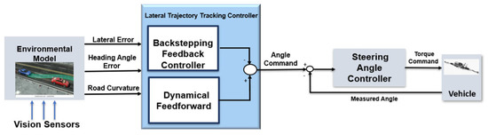 The backstepping control method has been widely used for trajectory following of different types of mobile robots at low speeds and using kinematic models; some of this work can be found in [3,4,5,6]. It has also been used in controlling autonomous underwater vehicles [7,8,9]. In our paper, backstepping is applied for highway autonomous vehicles at highway speeds of 60–70 mph and using a dynamical vehicle model. Sliding mode control (SMC) has been investigated for TTC [10,11,12,13]. The drawback of the sliding mode control is that it introduces undesirable vibrations called chattering, caused by the discontinuous part of the sliding mode control law. Even though there are some techniques to mitigate the chattering, such as the super twisting SMC [10], replacing the sign function by a saturation function [12], it will always exist because it can be reduced but not eliminated totally, especially in real time, when the controller is tested in the real vehicle. Furthermore, decreasing it comes at a price, impacting both the bandwidth of the controller and its tracking ability. While chattering is tolerable in electrical systems where the control input is voltage, it is not deemed acceptable in mechanical systems when the control input is torque, and since the steering angle command coming from the TTC will be converted to steering torque acting on the steering wheel, the chattering will be seen and felt by the driver. In [10], a combination of super-twisting SMC and backstepping control is developed to control the trajectory following of autonomous vehicles, where the control law is developed using SMC, and the backstepping is only used to prove the stability of the control system. One limitation of the control strategy in [10] is that it only controls the lateral deviation (lateral offset of the vehicle from the center of the trajectory) and vehicle yaw rate, but does not control the vehicle yaw angle (heading angle). Without controlling the yaw angle of the vehicle to follow the direction of the road, the trajectory tracking control will be poor at curved roads. Another limitation in [10,11,12,13], as in many other research papers, is that there is no feedforward strategy to compensate for curved roads. Feedforward is very important for computing the steering angle required to negotiate curved roads. The lack of yaw angle control and feedforward explains the deviation of the vehicle trajectory from the desired trajectory in figure 11 in [10]; much more accuracy is needed in real time at highway speeds for safety. They might not look that bad in Carsim and hardware in the loop (HIL) simulation, but these problems will become much more serious and might cause instability of the trajectory following when it comes to the real-time implementation in the real vehicle at highway speeds.