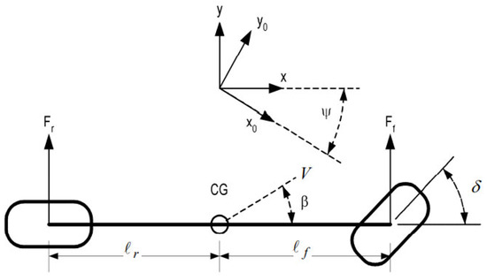 where refers to the side slip angle, which is the angle formed between the vehicle’s longitudinal axis and the direction of the velocity vector at its center of gravity (CG); denotes the longitudinal speed of the vehicle, which is considered constant; is the vehicle’s heading angle; denotes the front wheel steering angle that controls the lateral dynamics of the vehicle. The term refers to the cornering stiffness at the front wheel, while denotes the same at the rear wheel; refers to the vehicle’s mass; denotes the vehicle’s moment of inertia; refers to the distance between the center of gravity and the front axle, and is the distance from center of gravity to the rear axle.