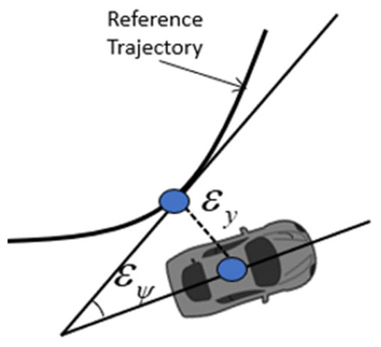 In the above Figure, denotes the vehicle’s lateral deviation, which is defined as the lateral distance between the vehicle’s CG and the desired trajectory. Also, denotes the vehicle’s heading angle deviation, which is defined as the vehicle’s orientation error with respect to the reference trajectory.