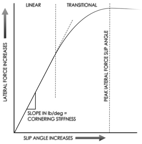 It is important to mention that the development of the dynamical bicycle model is based on the assumption that for small slip angles, the lateral forces are proportional to tire slip angle, and the proportionality constant is the cornering stiffness. Tire slip angle is defined as the angle between the orientation of the tire and the orientation of the velocity vector of the wheel, and it is a function of the side slip angle . The small slip angle range is between −4 and 4 degrees. As the slip angle increases beyond this range, we encounter a nonlinear region, as illustrated in Figure 4 (taken from the web), where the lateral forces depend not only on the slip angle but also on the normal tire load, tire road friction coefficient, and longitudinal tire force. In this situation, the bicycle model becomes invalid, and a more complicated tire model, incorporating the effect of these variables, is needed.