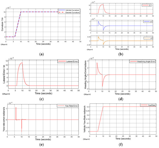 Different trajectories were generated to emulate different driving scenarios. In Figure 5a–f below, the trajectory starts with zero curvature and then ramps up to a constant radius curve of 100 m at 30 mps/108 kph to emulate transitioning from a straight road to a curved road. Figure 5a illustrates the vehicle’s actual curvature following the desired curvature very well. Figure 5b–e illustrates the virtual control errors, lateral position error, heading angle error, and yaw rate error, respectively. In the transitioning period from 6 to 10 s, there were some dynamics in the errors, and then, they all converged to zero asymptotically at steady state, as we proved in Section 2 above using the Lassalle–Yoshizawa theorem. Figure 5f illustrates the vehicle yaw rate during the maneuver, which indicates vehicle stability.