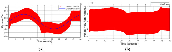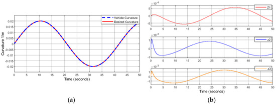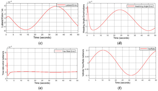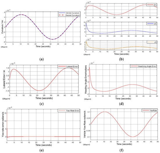 In Figure 6a–f below, a sine wave path was generated at 20 mps/72 kph to emulate successive curves in different directions or successive lane changes. The sine wave amplitude is 0.005 to represent a road of 200 m radius. Figure 6a illustrates the vehicle’s actual curvature following the desired curvature with near-zero errors. Figure 6b–e illustrates the virtual control errors, lateral position error, heading angle error, and yaw rate error, respectively. In this case, because the desired curvature is continuously changing and does not go to a steady-state value, the errors are also continuously changing to keep up with the changing curvature request. Figure 6f illustrates the vehicle yaw rate during the maneuver.