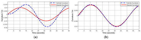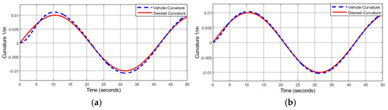 Measured vehicle curvature vs. desired curvature at 1 mps/3.6 kph, 100 m radius curve. (a) . (b) .